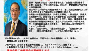 定例セミナー R7.9.28㈰第56回安全保障講演会のご案内 いま世界的に安全保障をめぐる環境が厳しさを加えています。安倍晋三首相秘書官として安保三文書など防衛政策策定の中心として活躍された、島田和久元防衛事務次官を講師としてお迎えし、国際情勢と我が国の防衛の在り方についてご講演頂きます。奮ってのご参... 2025.10.02 定例セミナー