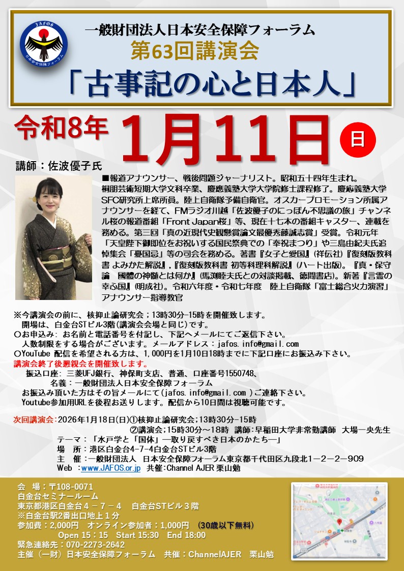 振込口座: 三菱UFJ銀行、神保町支店、普通、口座番号1550748、 名義:一般財団法人日本安全保障フォーラム お振込み頂いた方はその旨メールに(jafos.info@gmail.com )ご連絡下さい。 Youtube参加用URLを後程お送りします。実施から10日間は視聴可能です。