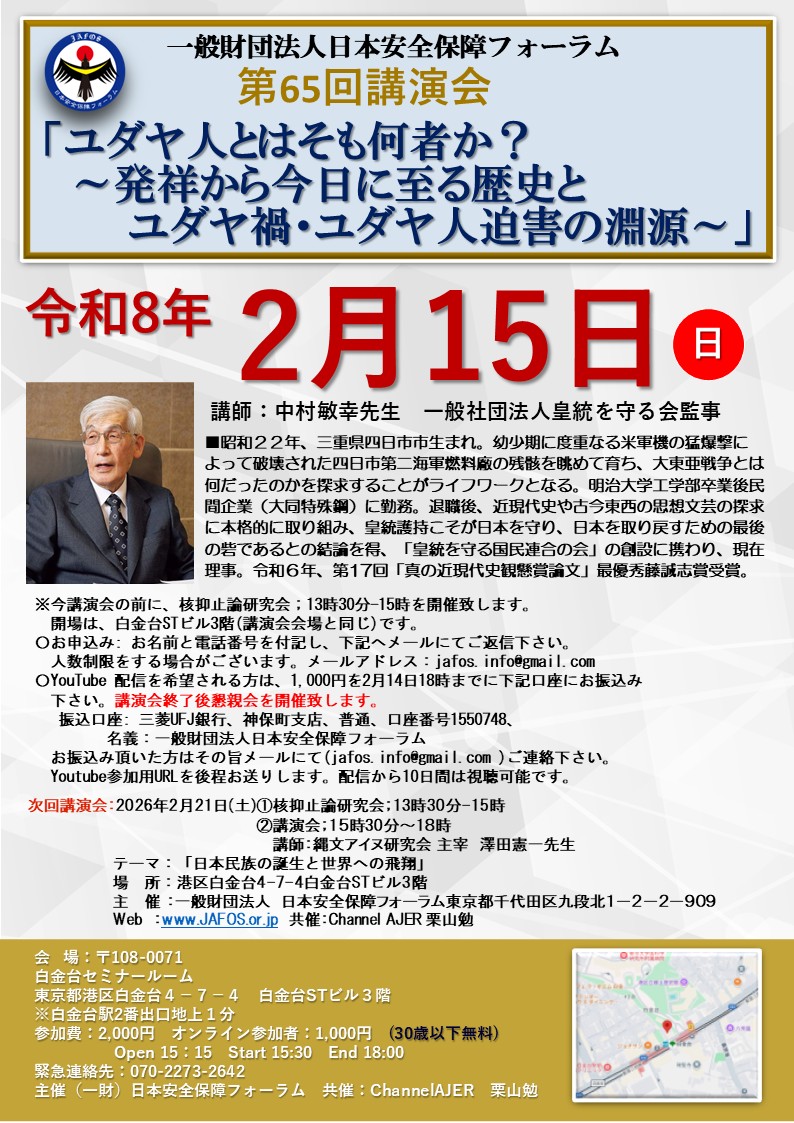 振込口座: 三菱UFJ銀行、神保町支店、普通、口座番号1550748、 名義:一般財団法人日本安全保障フォーラム お振込み頂いた方はその旨メールに(jafos.info@gmail.com )ご連絡下さい。 Youtube参加用URLを後程お送りします。実施から10日間は視聴可能です。